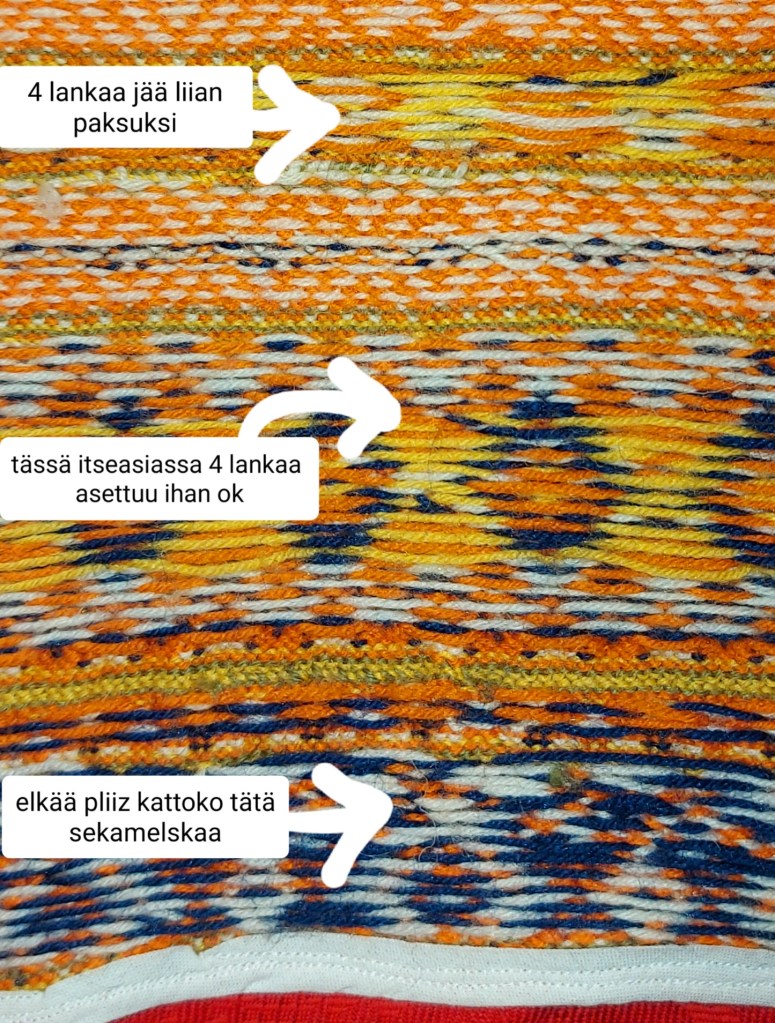 Kuvassa alla on kaksi neljällä värillä neulottua kuviota Muolaan rekkokaulurista: ensimmäisessä (omenaiset) kirjoneule jää liian paksuksi suhteessa ympäröivään neuleeseen. Toisessa neule vaihtuu vaihteittain kolmivärisen kautta neliväriseen, eikä neljällä värillä neulottu kohta siten jää pullottamaan kovin pahasti. Tässä kuviossa keltaisen lankajuoksut ovat pitkiä, mikä itseasiassa tuntuu auttavan asiaa. Pikiä lankajuoksuja on sidottu vain muutamassa kohtaa.