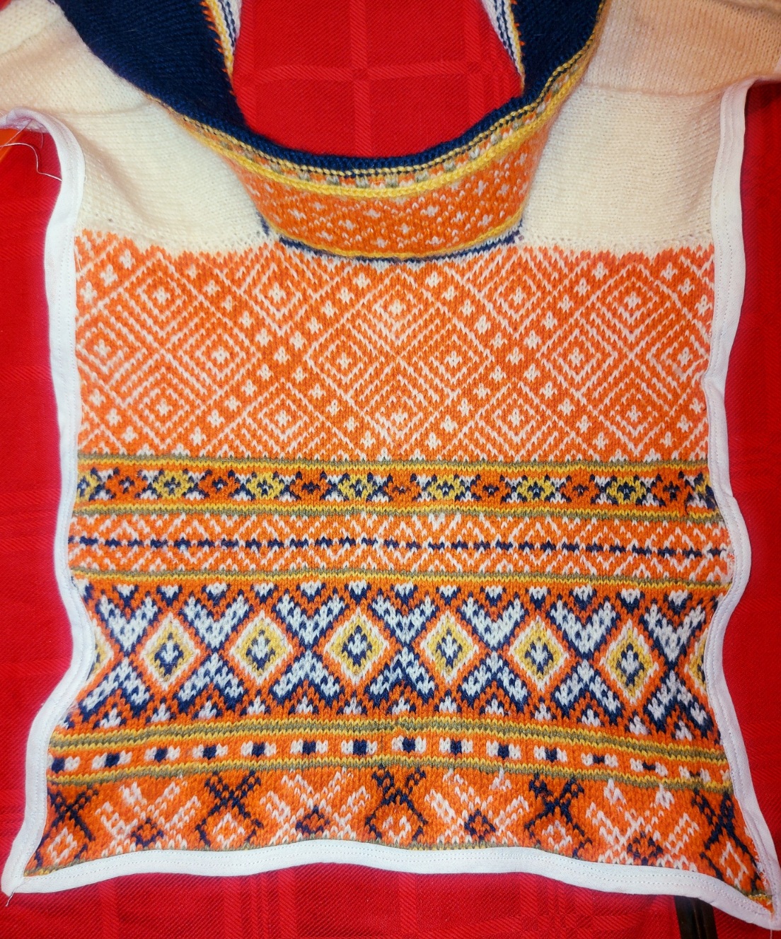 Keskimmäisellä rivillä leveä kirjoneuleraita onnistui yli odotusten, vaikka siinä tapahtuu paljon ja lankajuoksut ovat välillä kohtuuttoman pitkiä. Valkoinen on ollut tässä dominantti, keltainen tosin vielä sen päällä. Oranssi on alimpana. Valkoisen ja sinisen järjestyksen voisi kääntää ympäri niin, että järjestys olisi keltainen>sininen>valkoinen>oranssi. Noita keltaisia reunoja itseasiassa ei olisi edes pakko neuloa, vaan ne voisi hyvin kirjoa päälle jälkikäteen. Toisaalta neljällä värillä kirjoneulominen ei tässä kuviossa ollut vaikeaa ja lopputulos oli hyvä.