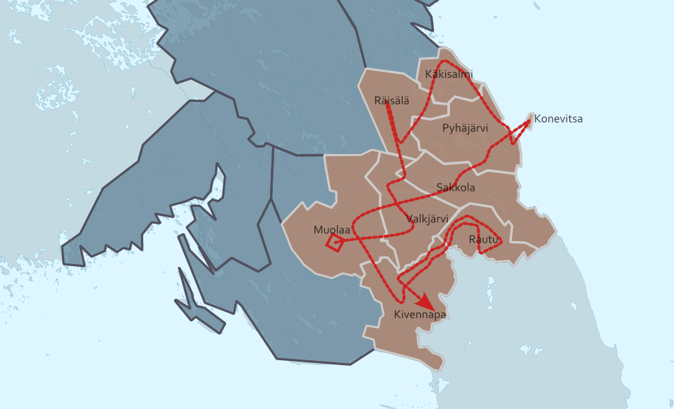 Alkupuolella toukokuuta Helsingistä tultuani Pyhäristin kirkolle läksin tästä matkalle 16 p. mainittua kuuta, ja vaelsin halki tämän pitäjän Valkjärven kirkolle. Tästä käänsin tieni pohjaista kohti Pasurin, Metsävirkin (Valkjärven pitäjää), Kuninkaanristin (Sakkulan pit.) ja Puukkalan kautta Haaparannan taloloihin lähellä Tiuriinkoskea (Räisälän pit.). Aikomukseni oli Vuosta pitkin kylä kylältä matkata Räisälän ja Kaukolan kautta Käkisalmeen. Vaan näillä seuduin kuin ei puuttunut minulle kelpaavata juuri muuta tuin vähän arvoituksia, päätin Haaparannasta lähteä suorinta tietä Käkisalmeen ja täältä kääntyä etelätä kohti matkaamaan, pitkin Laatokan rannetta, jossa saaliin toivoin tulevan paremmaksi kuin Vuoksen tienoissa. Sentähden erosin päiväksi tämän joen kauniista rannoista, ja potkaisin suoraan kuin linjalla Käkisalmea kohti Särkisalon kylään, myöskin Räisälätä. Päivä oli lauantai-päivä, ja Haaparannassa oli minun sanottu tästä kylästä kirkkomiesten venheessä hyvästi pääseväni ”linnaan”, joka tapahtuikin seuraavana eli 21 p. toukokuuta. Tämän kaupunkisen olin jo edeltä päin määrännyt matkani pohjaisimmaksi paikaksi, ja tästä käännyin siis etelätä kohti rientämään. Vaellukseni kulki siitä lähtien seuraavien mainittavampain kylien ja paikkojen kautta, nimittäin: Pörtsikkö ja Vuohensalo (Käkisalmen pitäjää), Riiska, Sortanlaks, Vernitsa (josta käsin kävin Konevitsankin pyhää paikkaa katsomassa), Yläjärvi, Ryhmänkylä, Enkkua (Pyhäjärven pitäjää), Saapro, Haitermaa ja Röykkylä (Sakkulan pitäjää), josta viimeisestä kylästä palasin Valkjärven kautta takaisin Pyhäristin kirkolle. Vähää ennen oli matka-kumppanikin ennen tehtyä päätöstämme myöten tullut tähän, ja siitä kulimme nyt yhtenä Kivennavan kirkolle. Tästä siirryimme taas hiljanverkkaan Ahjärven, Vuottaan, Kaukseman, Miettilän ja Lipolan kautta Anttolan myllylle, joka jo on Raudun pitäjää. Tässä erosimme pariksi päiväksi. Kumppalini matkusti Kuusenkannan ja muiden kylien kautta yhtymä-paikkaamme kirkolle, minä taas Orjansaaren ja Mäkrän kautta. Raudun kirkolla ystävällisessä paikassa levättyämme, erosimme taas niin, että Slöör poikkesi siihen osaan Sakkulaa eli tämän pitäjän itä-puoleen, jossa minä vielä en ollut käynyt, minä sitä vastaan läksin vielä Rautulaisia laulattamaan, joka tapahtui enimmin Keripadan, Kattilan, Liippuan, Raasselin (aivan rajalla) ja Palkealan kylissä. Raudulta palasimme samaa tietä, jota tulleetkin olimme, takaisin Kivennavalle, jossa matkamme loppuikin Suomen rajojen sisässä. Syy, minkätähden koko länsi-osan eteläistä Viipurin lääniä jätimme tutkimatta, tulee alempana kerrotuksi.