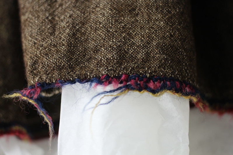 Kude: Kuteen laatu ei erotu kuvassa. Kude ei pilkahtele loimilankojen välistä, joten mahdollisesti kuteena on käytetty vaaleaa lankaa. Yleensä villalankanauhoissa on käytetty kuteena vaaleaa pellavalankaa.