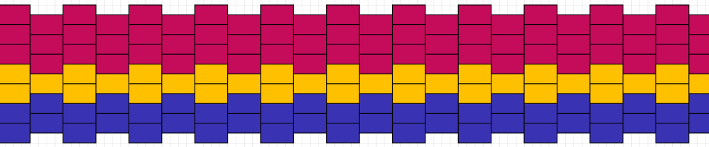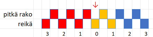 Loimi: 6 tumma sininen, 4 keltainen, 6 vadelman punainen (kaikki suunnilleensamanpaksuista villalankaa)