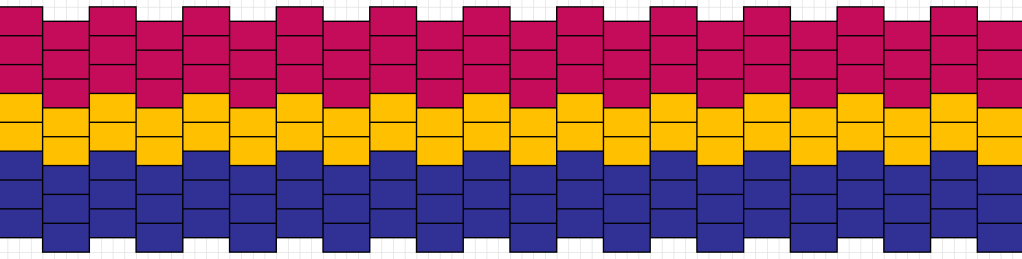 Mallinauhan leveys on 11 mm, eli hyvin lähellä esikuvan leveyttä. Sininen ja punainen lanka Istexin Fjallalopi (tex 333×1, 100g=300m), keltainen sekä violetti kude Garnhusetin 6/2 villalankaa (tex 156×2, 100g=320m). Minulla ei ollut tähän oikean sävyistä aniliinin punaista, joten käytin violettia. Istexin Fjallalopi on yksisäikeistä. Tyypillisemmin pirtanauhoissa on käytetty kaksisäikeistä villalankaa.