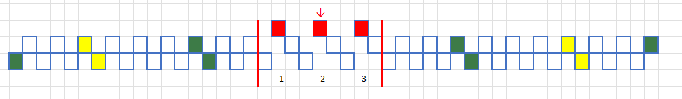 Pomintakuviot voi tietenkin suunnitella vapaasti, mutta muutama realiteetti kannattaa huomioida. Ensinnäkin, kuviolangalla ei pitäisi tehdä viittä viriötä pidempiä juoksuja. Toisin sanoen kuviolanka voi olla samalla puolella nauhaa korkeintaan viiden kerroksen verran. Liian pitkät lankajuoksut eivät toimi käytössä. Toinen realiteetti on, että kuviolanka kannattaa vaihtaa nauhan etupuolelta takapuolelle ja päinvastoin ainoastaan loimen reikien kohdalla. Selitän tätä tarkemmin.