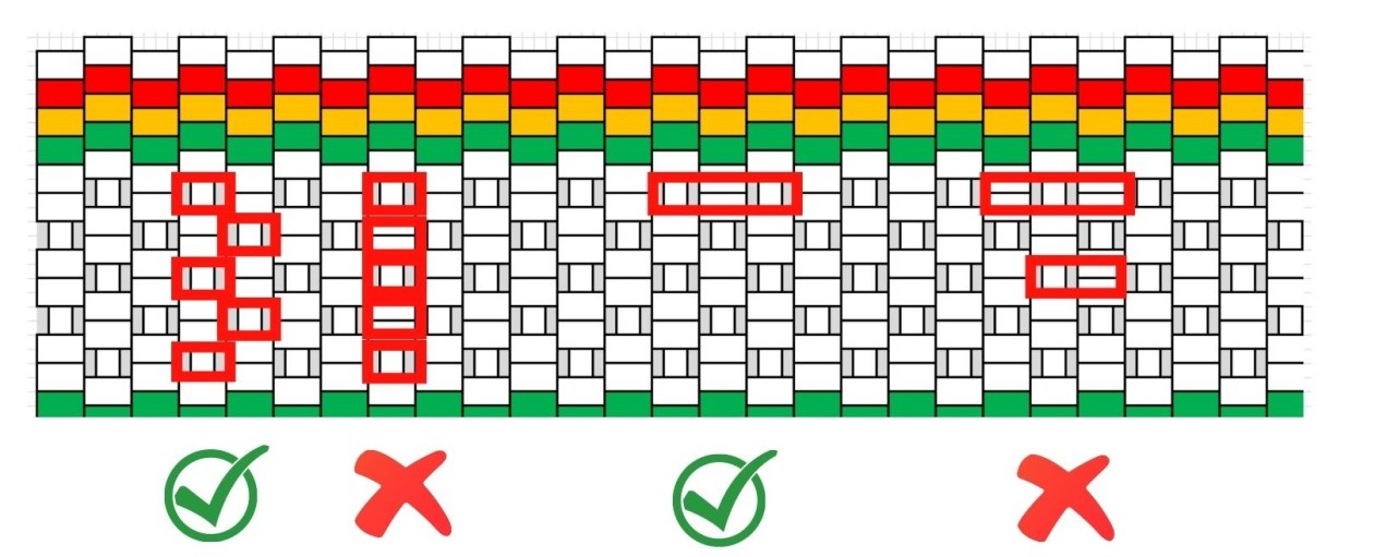 Pomintakuviot voi tietenkin suunnitella vapaasti, mutta muutama realiteetti kannattaa huomioida. Ensinnäkin, kuviolangalla ei pitäisi tehdä viittä viriötä pidempiä juoksuja. Toisin sanoen kuviolanka voi olla samalla puolella nauhaa korkeintaan viiden kerroksen verran. Liian pitkät lankajuoksut eivät toimi käytössä. Toinen realiteetti on, että kuviolanka kannattaa vaihtaa nauhan etupuolelta takapuolelle ja päinvastoin ainoastaan loimen reikien kohdalla. Selitän tätä tarkemmin.