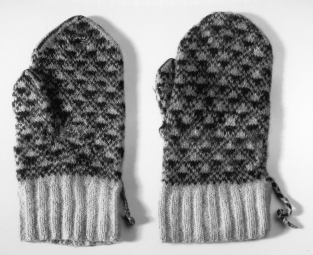 Malli: Amalia Halli, Tytärsaari. Malli on Tytärsaarella vanha. Väreinä on käytetty mustaa ja valkeaa. Kintaan suuhun voitiin neuloa viistolliset. (Vahter 1931.)