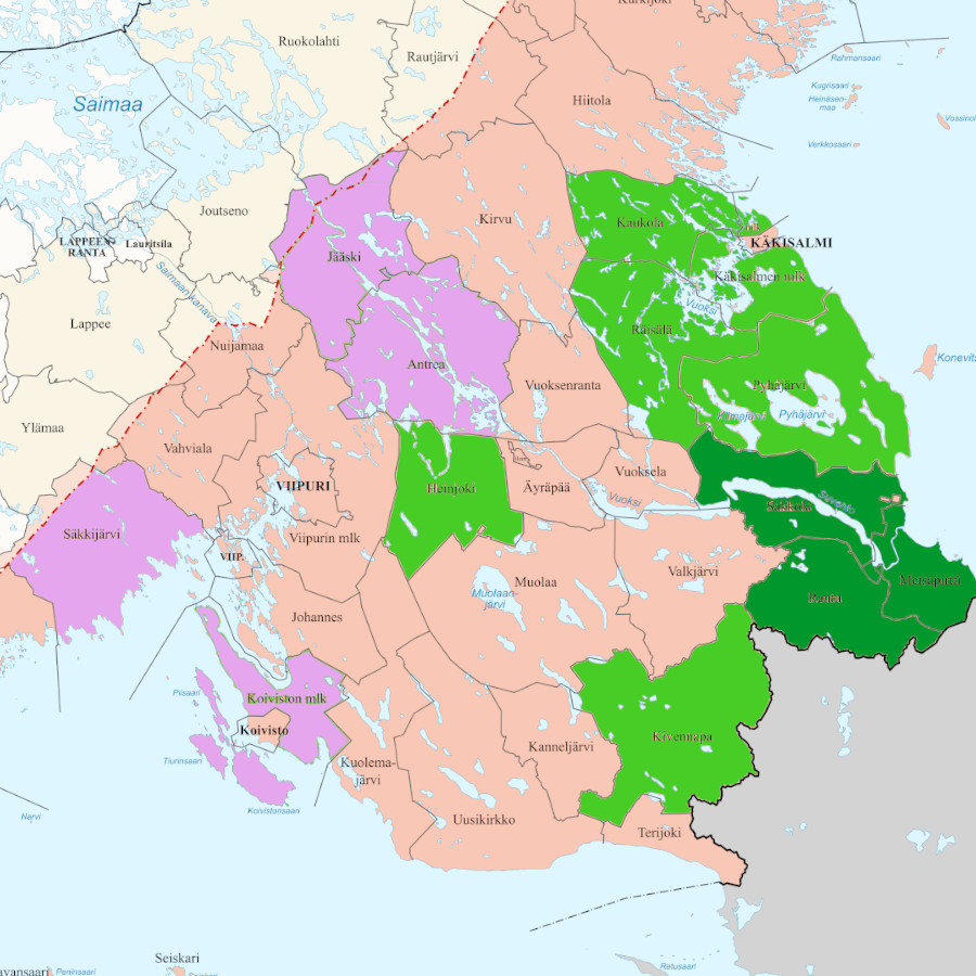 Johdonmukaisimmin ostonauhoja on käytetty koivistolaisissa rekkopaidoissa. Mahdollisesti tyyli on esiintynyt myös Kuolemajärvellä. Alla ovat kuvattuna tuntemani tapaukset, lisäksi löytyy koivistolaiset rekkoyliset Néprajzi Múzeum NM 4125, jossa on todella iso rekko. Museoiden metatietojen mukaan Kansallismuseon K6816.106 ja Lahden museoieden LHMVHMAE494 ovat Antreasta ja Jääskestä, mutta koivistolaista tyyliä ne edustavat siitä huolimatta. Jääskeläiseen kansanpukuun rekko ei kuulunut.