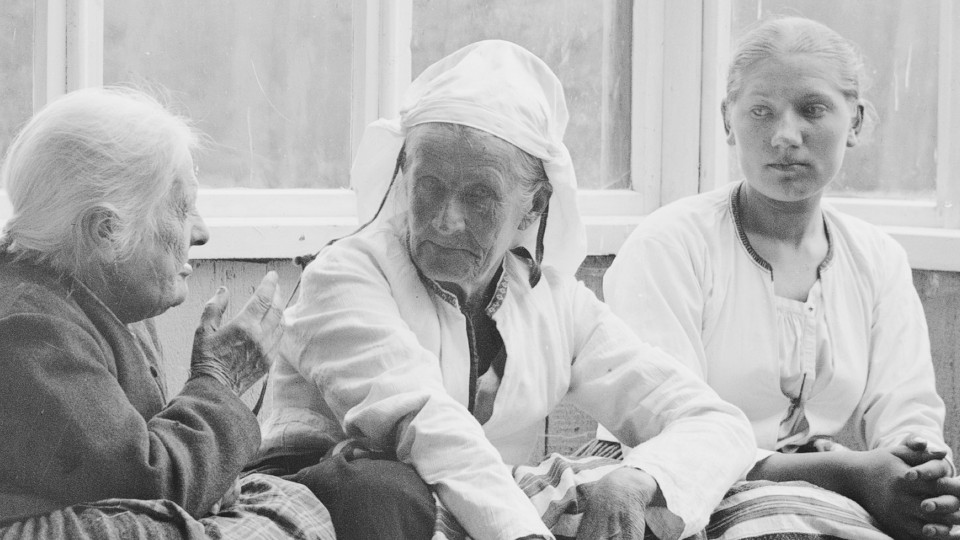 Artikkelikuva: malleja Ruokolahden eukkoja kirkonmäellä -maalausta varten Albert Edelfeltin ateljeessa HK19350115:5.