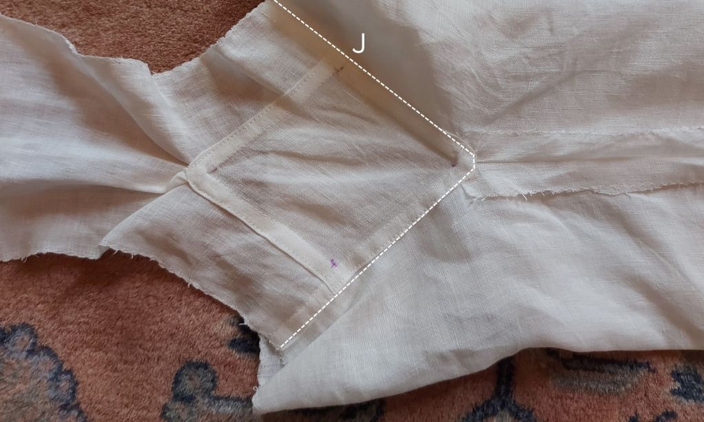 12. Käännä kainalotilkun/kylkikappaleen saumavara hihan saumavaran päälle ja tikkaa paikoilleen. Jos käytät ohutta kangasta, pitäisi tämän onnistua ongelmitta myös aiemman katesauman ja tämän uuden sauman leikkauspisteessä (J). Mikäli käytät paksumpaa kangasta, kannattaa katsoa, miten tässä on ommeltu kainalotilkun saumat. Paksummalla kankaalla tuohon J:n kohdalle tulee muuten ihan mahdoton pomppu.