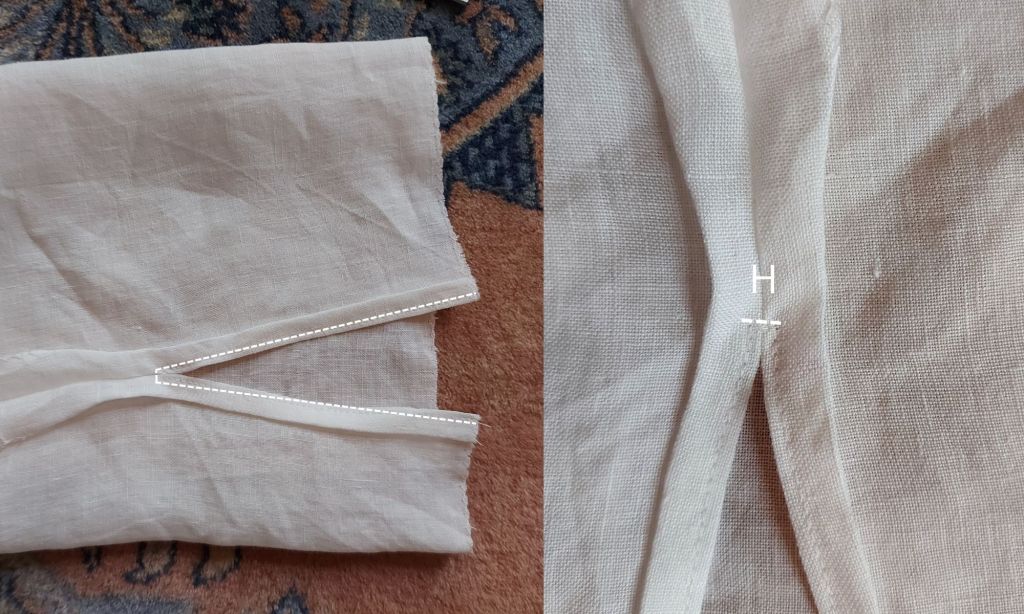 13. Tee hihansuun halkioon kaksinkertainen päärme. Halkion alkukohdassa (H) tikkaa pari kertaa edestakaisin, jotta hihan alasauma ei lähde purkautumaan.