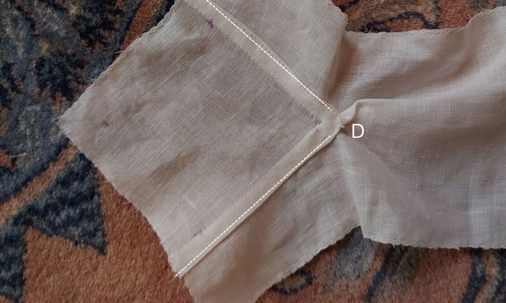7. Tikkaa saumavarat paikoilleen mahdollisimman läheltä taitetta. Kiinnitä huomiota siihen, ettet huolimattomasti tikkaa kainalon alle jäävien ryppyjen yli (D). Helpointa on edes olla yrittämättä ommella alakulmaa samalla, ja sen sijaan viimeistellä katesauma tikkaamalla kulman päälle lyhyesti kappaleen oikealta puolelta (ks. kuva alla).