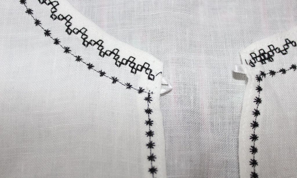 Tässä miun paidassa tikkaukset on tehty ompelukoneen kuvio-ompeleilla päärmätyn kaula-aukon ja sepaluksen päälle. Tikkausta on leveämmälti kuin historiallisissa paidoissa, mutta kuviot itsessään vastaavat Karjalassa käytettyjä. Erityisesti “tähtikuviota” olen nähnyt paidan sepaluksissa käytettävän.