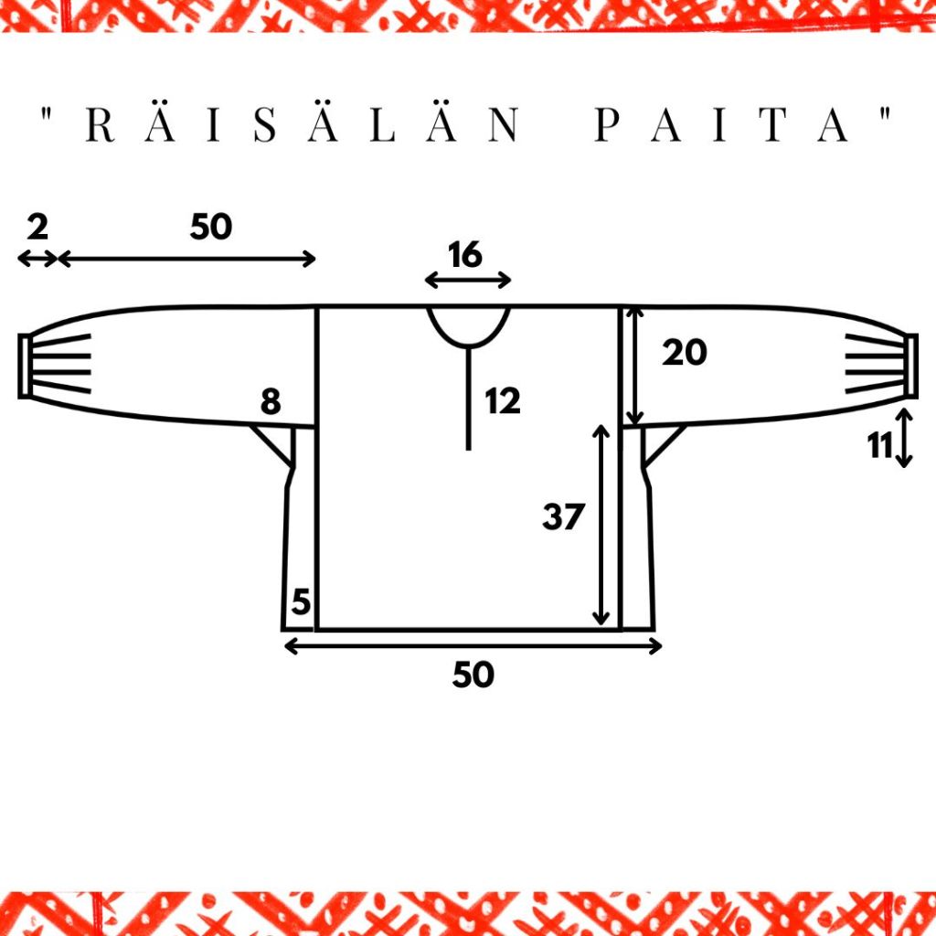 Millaisia Räisälän paitojen tikkaukset tarkalleen olivat, jäi pimentoon. Tarkkoja valokuvia tai piirroksia historiallisten paitojen kuvioinneista ei ole. Enkä valitettavasti pääse tarkastelemaan lähemmin Pietarissa säilytettävääs räisäläistä paitaa.