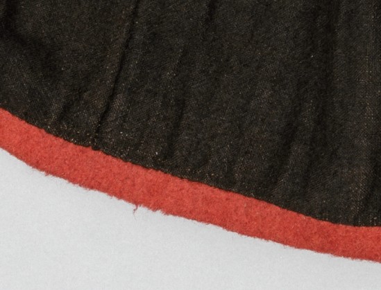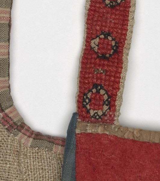 Kaikkia kankaita on nähdäkseni vanutettu, ei kuitenkaan samoissa määrin. Ylärivillä ruskeassa ja sinisessä kankaassa sidos on edelleen selvästi näkyvissä. Alarivillä sinisessä ja mustassa kankaassa sidos on näkyvissä ainoastaan niissä kohdin, missä villavanu on kulunut pois.