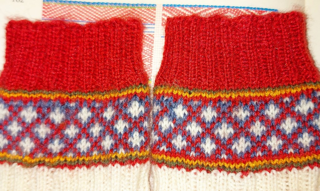 Valkoinen kuvio tulee tietysti helpommin näkyviin, kun valkoisen neuloo edellä eli siis dominattina. Mielestäni kuitenkin kauniimpi ratkaisu on neuloa kuvio dominantilla punaisella. Tällöin kuviossa on punainen kirjonta valkoisella taustalla (kuten myös paidan rekon kirjonnassa, mitä tämä neule jäljittelee).