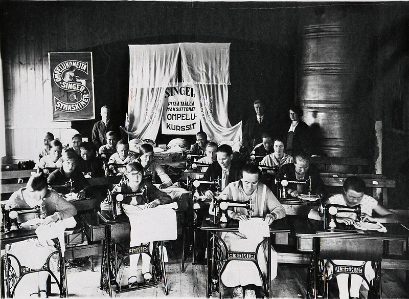 Käsityöopetusta tarjosi myös ompelukoneita myynyt Singer. Ompelukurssi Suurkylässä. Kymenlaakson museo YLEV8965
