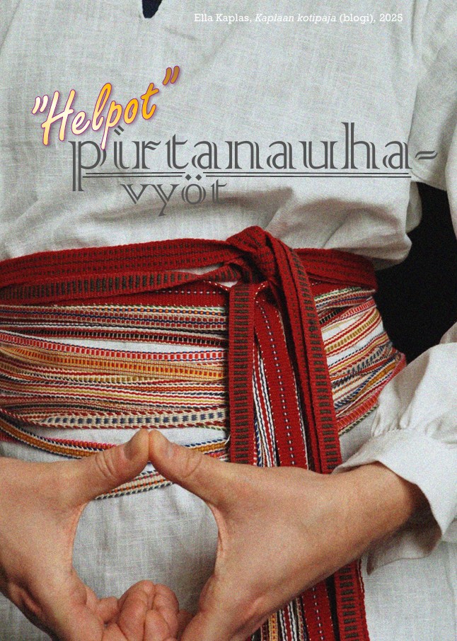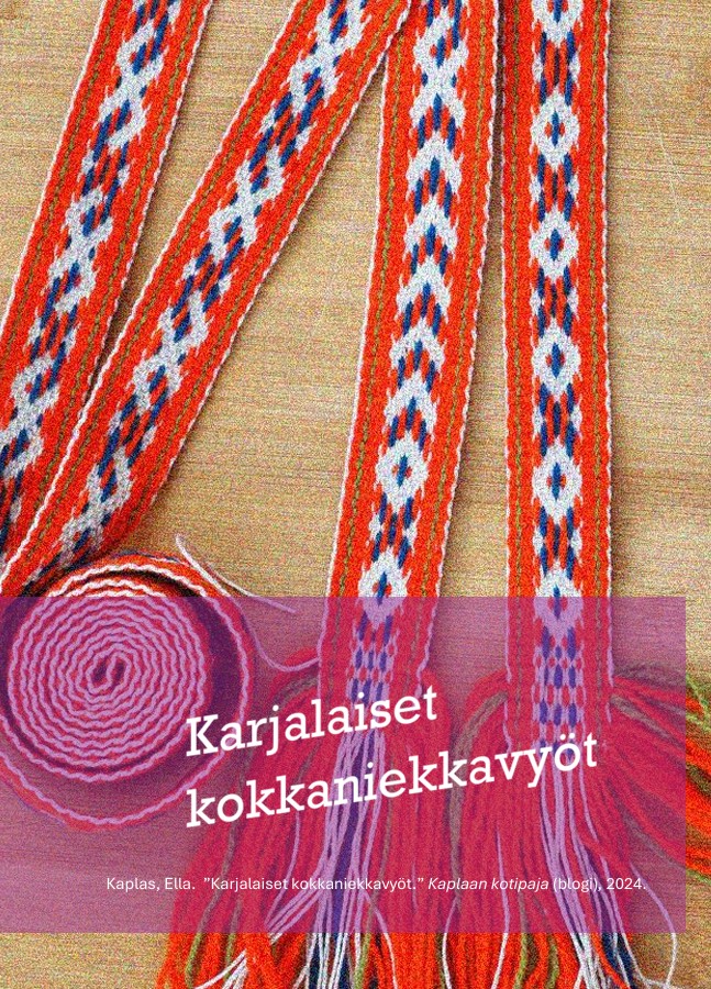 Täsmennyksiä julkaisuun: Sivulla 2 hameista puuttuu esinenumerot. Yllä Ruokolahti LHMVHMAE2402:943 ja alla Ruokolahti EKME4068. Sivulla 2 kerrotaan, että helmaveran sijaan käytetään pirtanauhaa erityisesti arkisemmissa hameissa. Tämä koskee Ruokolahtea. Käkisalmen kihlakunnan ja Sakkolan ja Raudun hameiden suhteen en osaa sanoa pirtanauhan arkisuudesta.