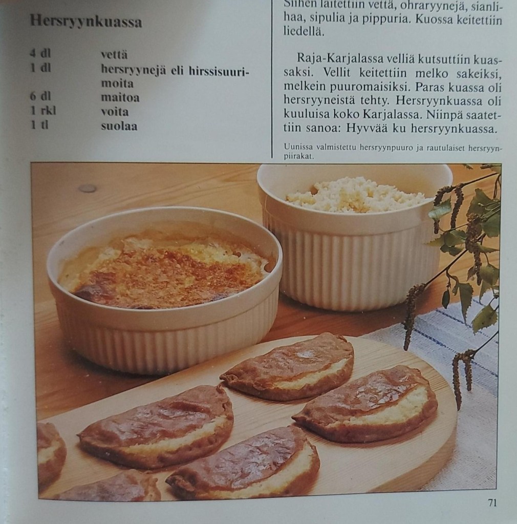 Tässäpä yksi vaihtoehto tavallisille riisitäytteisille piirakoille: hersryyni eli hirssipiirakka. Hirssiä on käytetty riisin tapaan hienoihin ruokiin, ja se on maultaan mieto ja tuntumaltaan pehmeä. Kaikki tähän artikkeliin siteeratut ohjeet ovat Karjalankannakselta, jossa ei juurikaan leivottu arkkityyppisiä soikeita karjalanpiirakoita.