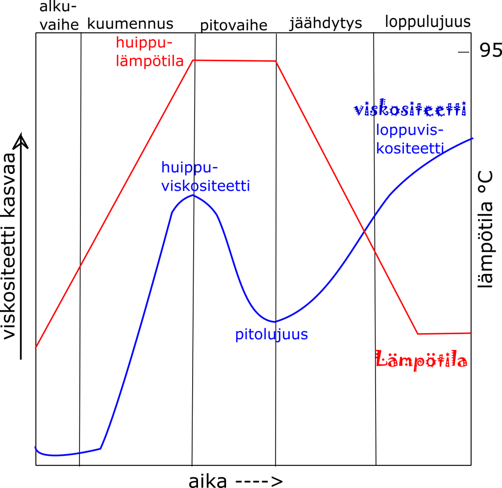 3 Pitovaihe: Kun lämmitystä jatketaan maksimilämpötilassa (90–95 °C), saavuttaa kiisseligeeli pitolujuutensa (holding strenght) eli alhaisimman viskositeettinsa kypsennyksen aikana. Akateemisessa tärkkelystutkimuksessa kauravelliä on yleensä kypsennetty 30 minuuttia 95 asteessa. (Zhou et al 1998, 278). Tästä saa siis jotain ohjenuoraa myös siihen, kauanko kaurakiisseliä pitäisi kypsentää, että liisteröityminen varmasti on täydellinen. Perinneruokaohjeissa harvoin mainitaan tarkkoja kypsennysaikoja – jossain on mainittu ohjeena kiehuttaa kiisseliä 15 minuuttia.